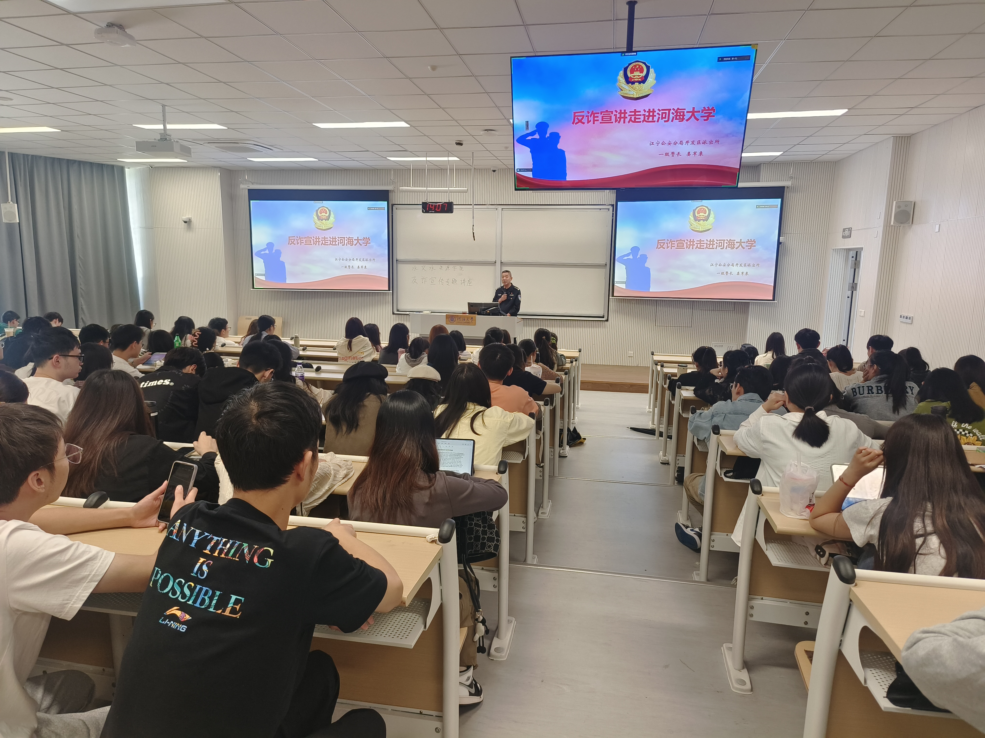 为向研究生新生全面普及防范电信诈骗知识,有效减少电信网络诈骗案件发生,营造全民反诈的良好校园氛围,10月11日,公司在常州校区举办研究生新生防范电信诈骗主题教育讲座,讲座由南京市江宁开发区派出所娄军来警官主讲,全体研究生新生参与讲座。