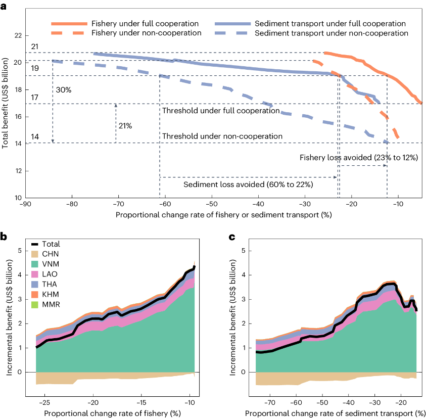 a.在合作和全面合作模式下,水电和水稻产量总收益与生态影响的关系;b.全面合作的收益增量与各国渔业损失的关系;c.合全面合作的收益增量与各国泥沙运输损失的关系。