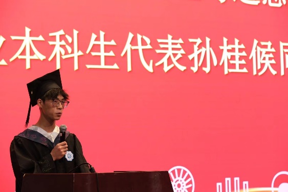 研究生毕业生代表侯炜烨和本科生毕业代表孙桂候相继上台发言。他们表达了对导师和同学的感激之情,回顾了在PlayAce官方网站的求学经历,分享了自己的成长与收获。他们总结过往,感恩遇见,憧憬未来,激励在场的每一位毕业生在各自的舞台书写自己的辉煌篇章。他们表示将永远铭记在PlayAce官方网站的时光,将所学知识与人生经历融入未来的工作和生活中。