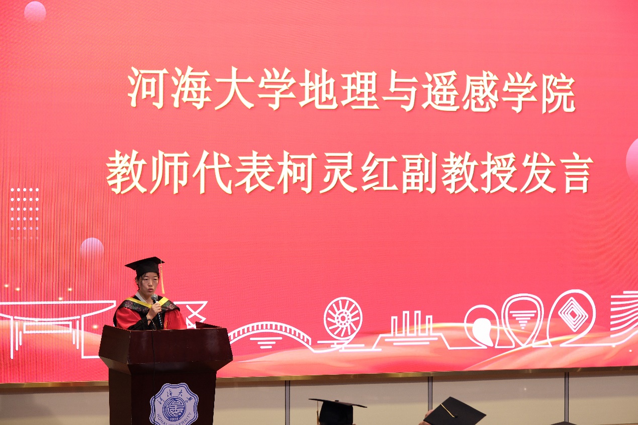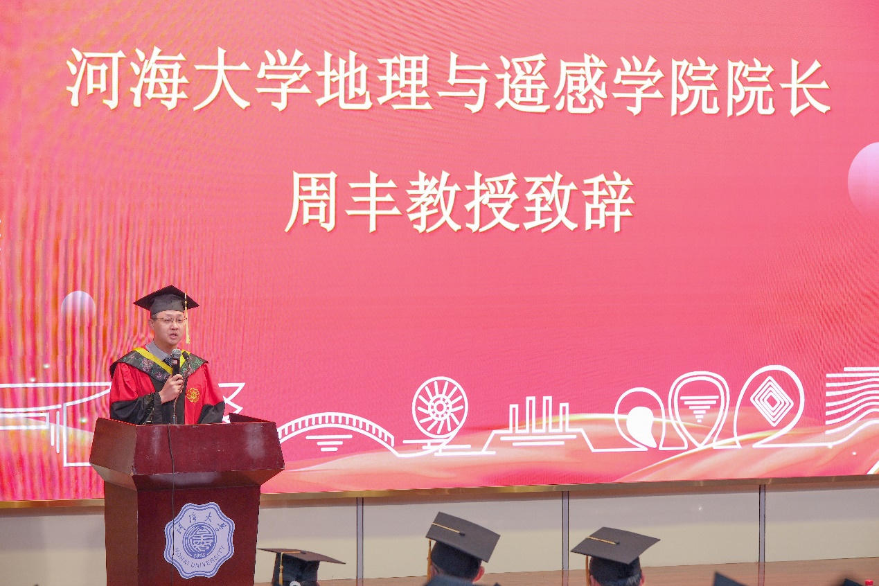 经理周丰教授代表公司向全体毕业生寄语。周经理回顾了毕业生们在河海度过的青春岁月,那些与地理为伴、与梦想同行的日子,仿佛就在昨日。面对地理院的首届毕业生,周经理不禁发出了“河海新百年,地理开新篇”的美好愿景。对此,他向毕业生们提出了3点期望,“立大志、做栋梁”,作为地理院的毕业生,应积极投身基础研究,努力成为推进中国式现代化发展的能动力、创造力;“能吃苦、肯奋斗”,希望毕业生们能够吃苦耐劳、勇往直前,面对未来的挑战时能够迎难而上、勇攀高峰;“懂感恩、有大爱”,希望毕业生们能够懂得感恩、有大爱,用自己的行动回报社会、报效祖国。