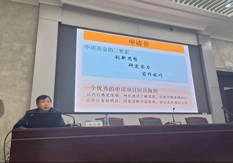 徐卫国研究员从国家自然科学基金的基本概况、基金申请书的撰写和基金申请注意事项三个方面开展专题报告。他着重阐述了申请书各个模块内容的写作技巧,强调优秀的申请项目要对研究现状了解清楚,分析问题精准到位,内容清晰方法具体,语言表达通俗易懂。