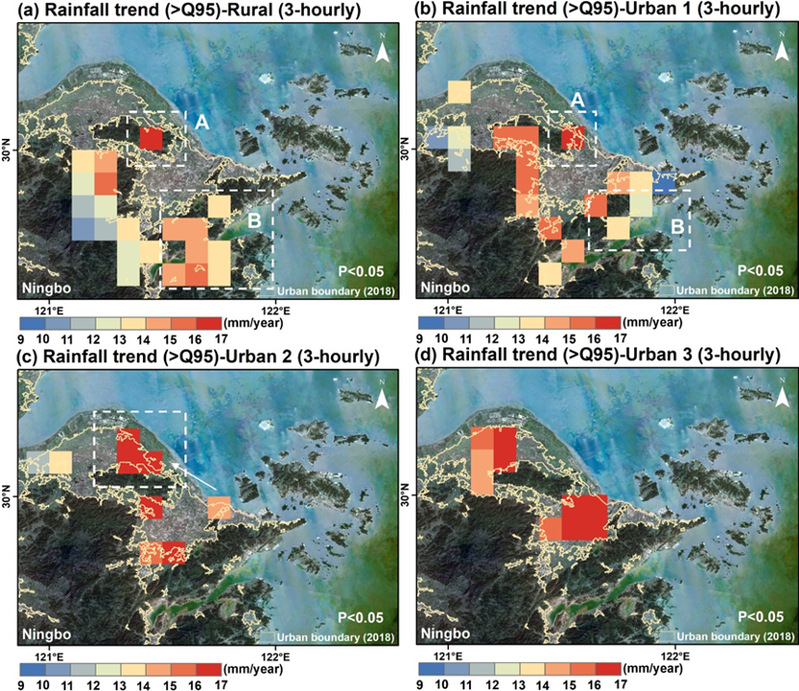 研究方法包括:(1)定义极端降水强度阈值,使用1979-2000年雨季(5-9月)的80%,85%,90%,95%分位数作为阈值,计算每年各强度等级的强降水总量;(2)动态划分城市与非城市区域,基于GUB数据对每个网格进行动态分类;(3)将城市群内的降水网格根据GAIA数据的不透水表面比例细分为四个等级,以评估不同城市化水平对极端降水的影响;(4)计算城市化效应,通过比较城市和农村区域的降水趋势差异来量化城市化对极端降水的影响。