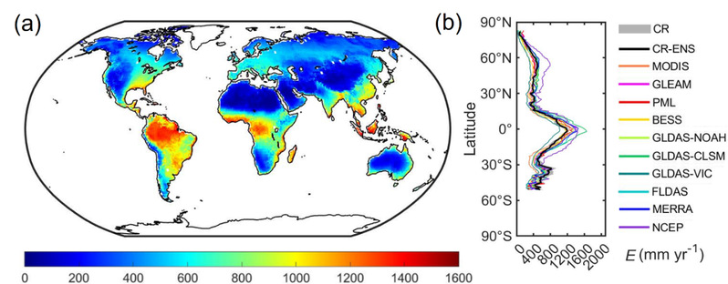 准确估算陆地蒸散发对深入理解水文循环和支撑可持续水资源管理至关重要。然而,现有蒸散发模型由于依赖复杂的气象输入参数(如降水)以及对植被和土壤过程的复杂参数化,常面临显著的不确定性。本研究使用一种基于物理过程且无需参数校准的蒸发互补(Complementary Relationship, CR)模型,该模型基于陆气间水热耦合过程,仅需常规气象变量——辐射、温度、湿度和风速,即可实现地表蒸散发估算,从而避免了对复杂地表参数的需求。