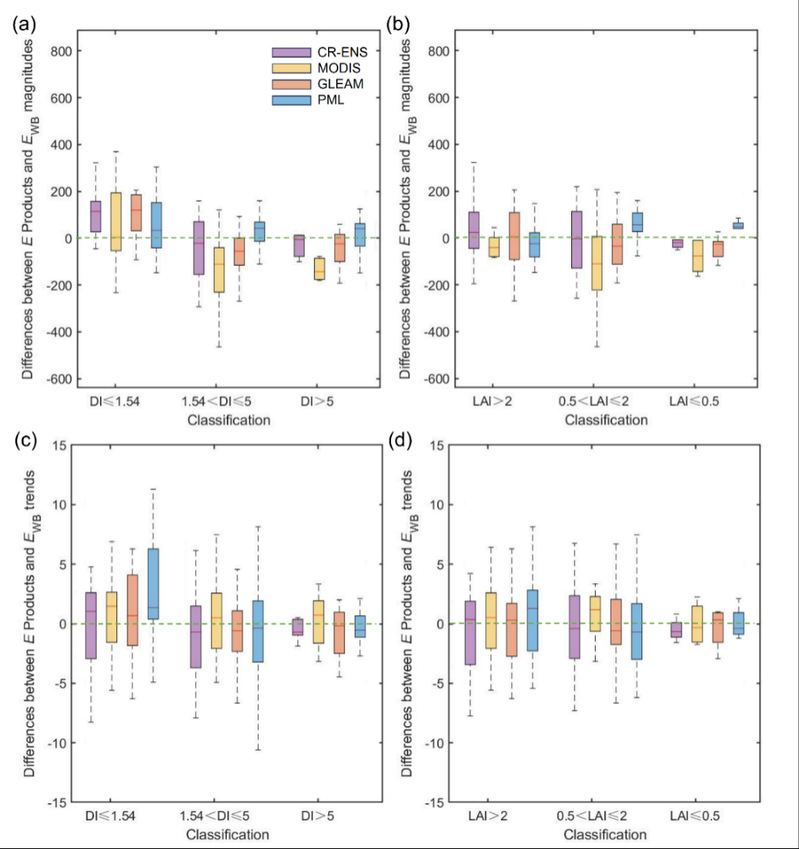 图1 四种蒸散发产品与全球流域蒸散发基准值的差异对比