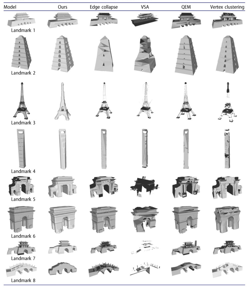 研究团队以天安门、埃菲尔铁塔等中西方典型地标为例开展实验验证。实验结果表明该方法在识别性、结构显著性与视觉清晰度等方面全面优于传统几何简化算法(如QEM、Edge Collapse、VSA),显著提升了用户感知体验。该方法对于地标模型的最高压缩比达99.67%,显著了提升模型的空间存储效率。此外,研究还发现:地标模型的孔洞占比越小,需要夸张表达的程度越高。该发现为认知驱动的三维地图智能制图提供了新思路。