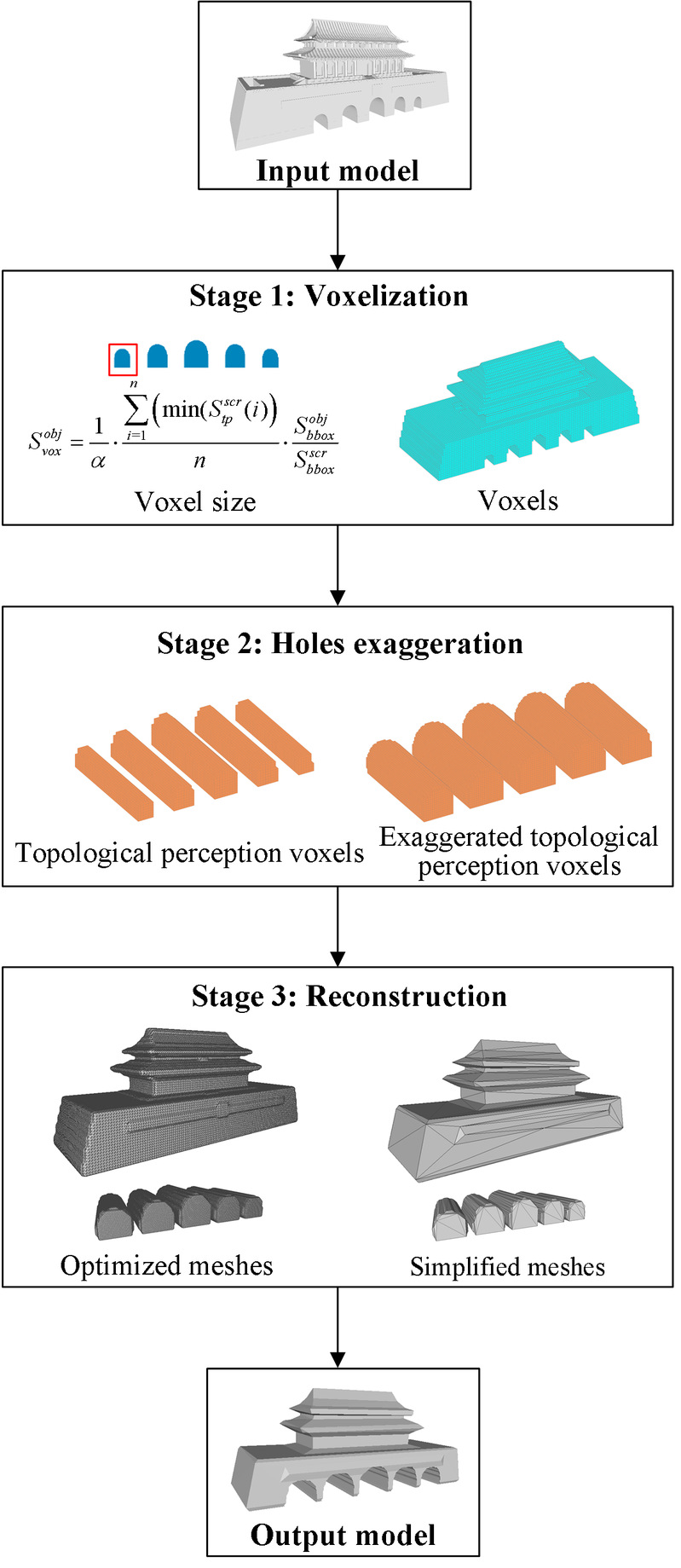 针对这一问题,公司丁远副教授联合南京师范大学、新南威尔士大学等单位研究人员,提出了一种基于拓扑知觉的三维地标模型简化方法,首次将陈霖院士提出的拓扑知觉理论引入三维地标自动简化过程。该方法通过体素化处理、孔洞识别与夸张表达,以及模型优化与简化,有效压缩模型体量的同时,强化地标中关键孔洞结构的视觉表达。