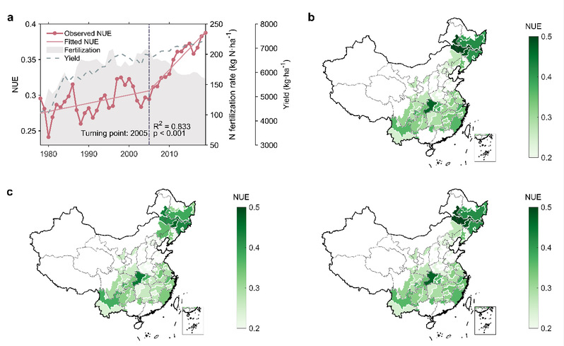 氮肥利用效率(Nitrogen Use Efficiency, NUE)是衡量作物的氮肥吸收和利用能力的重要指标。提高NUE不仅能够降低农业生产成本,还能减少活性氮损失及生态环境影响。作物NUE呈现出显著的时空分异,其演变规律及关键驱动因素仍不清楚,制约了氮肥管理优化及农业绿色发展。