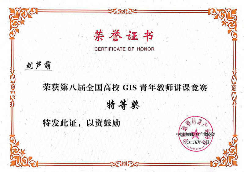 第八届全国高校GIS青年教师讲课竞赛刘芦萌获奖证书