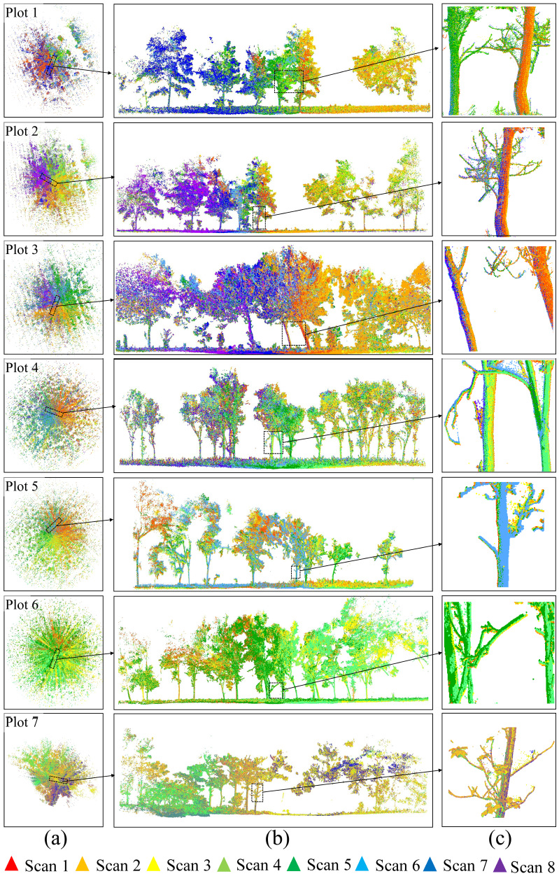 图2. 在7个样地的配准结果:(a) 整体视图;(b) 剖面视图;(c) 局部放大视图
