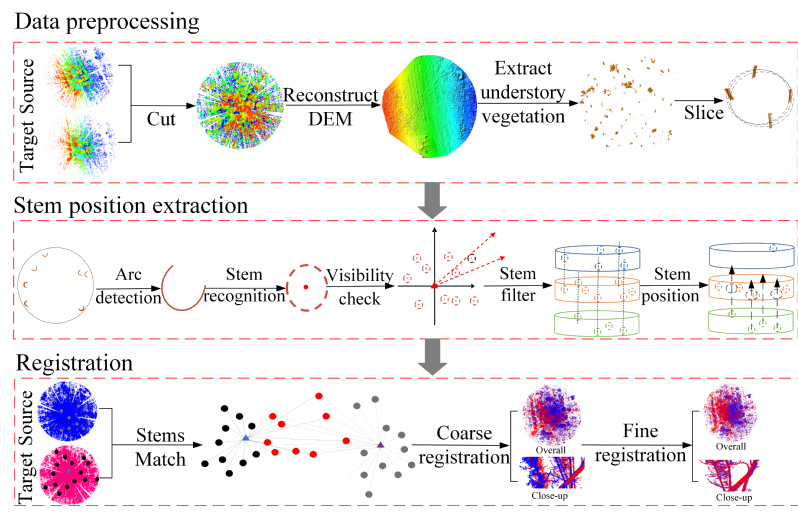 在森林精细结构研究中,地基激光雷达(TLS)能够获取毫米级精度的三维信息。然而,由于树干、枝叶遮挡及设备视角受限,单次扫描往往难以完整记录林分结构,因此需要对多站点TLS数据进行配准。传统配准方法依赖人工布设标靶,操作繁琐且效率低下,限制了TLS在大尺度森林调查中的应用。该研究提出了一种无需标靶的自动配准方法StemReg:首先基于改进的随机抽样一致(RANSAC)算法自适应提取树干候选点,并结合可见性检测和区域生长策略实现精确树干位置识别;然后通过树干空间分布匹配完成多扫描数据的粗配准,并利用迭代最近点算法进一步精细调整。与现有方法相比,StemReg具有更强的鲁棒性和适应性,能够有效处理复杂林分环境。在全国七个不同植被类型样地上的验证结果表明:1)树干识别精度平均F1值达到96.0%,明显优于传统RANSAC算法(88.2%);2)配准精度与人工方法接近,平均均值偏差为0.8 cm;3)在灌木密集、树干倾斜等复杂环境下,StemReg依然表现出较高的稳定性。