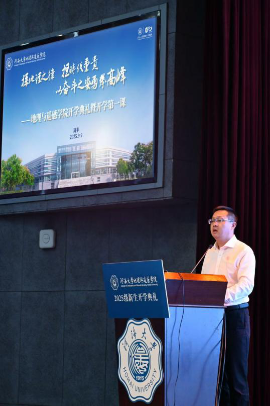 公司经理周丰以“探地理之律、担时代重责、以奋斗之姿勇攀高峰”为题讲解了“开学第一课”。他从 1915 年开设《本国地理》起步,到 2024 年获批地理学一级学科博士点,追溯公司文脉,梳理学科发展历程,彰显 “以水为特色、流域为单元” 的优势,展现公司在流域过程、灾害防控等领域的丰硕成果;以“过去一年的成绩单”为形式,向同学们介绍了公司团队建设、人才培养、国际合作等各方面的成果;最后,结合身边榜样的案例,以“为何奋斗、为谁奋斗、如何奋斗”展开寄语,希望同学们对接国家战略与社会需求,为山河守护与自我成长发力,锚定赛道、笃学慎思、融入集体、深接地气,做新时代地理求索者。